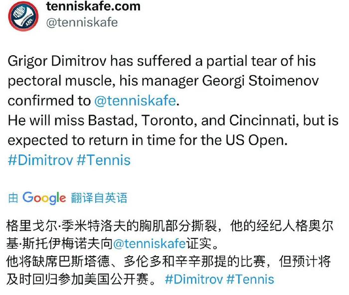 再来关注下保加利亚人迪米特洛夫。根据其团队的最新消息,迪米特洛夫目前受伤非常严重,胸肌撕裂恐终结2025赛季。