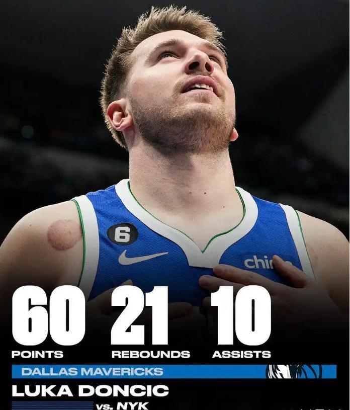 2022年12月28日,东契奇在第四节最后时刻故意罚球不进,篮板球争抢最终掉到他手中立刻出手投篮命中扳平比分拖入加时,最终全场比赛东契奇狂砍60分21板10助攻的超级数据,比哈登的数据更加炸裂。