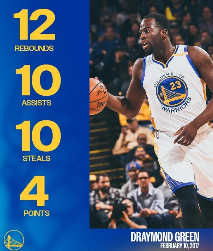 单场拿到10抢断非常难,追梦格林做到了,他还做到了三双,距离四双仅一步之遥,而让他错失四双的,竟然是最容易刷的得分!