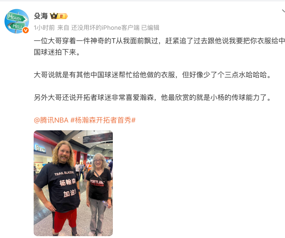 这位中年大哥球迷表示,开拓者球迷非常喜欢杨瀚森,他最欣赏杨瀚森的传球能力,而杨瀚森的首秀表现如何令人期待。