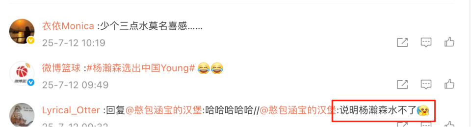 不过对此网友则是神评论表示“说明杨瀚森水不了”。